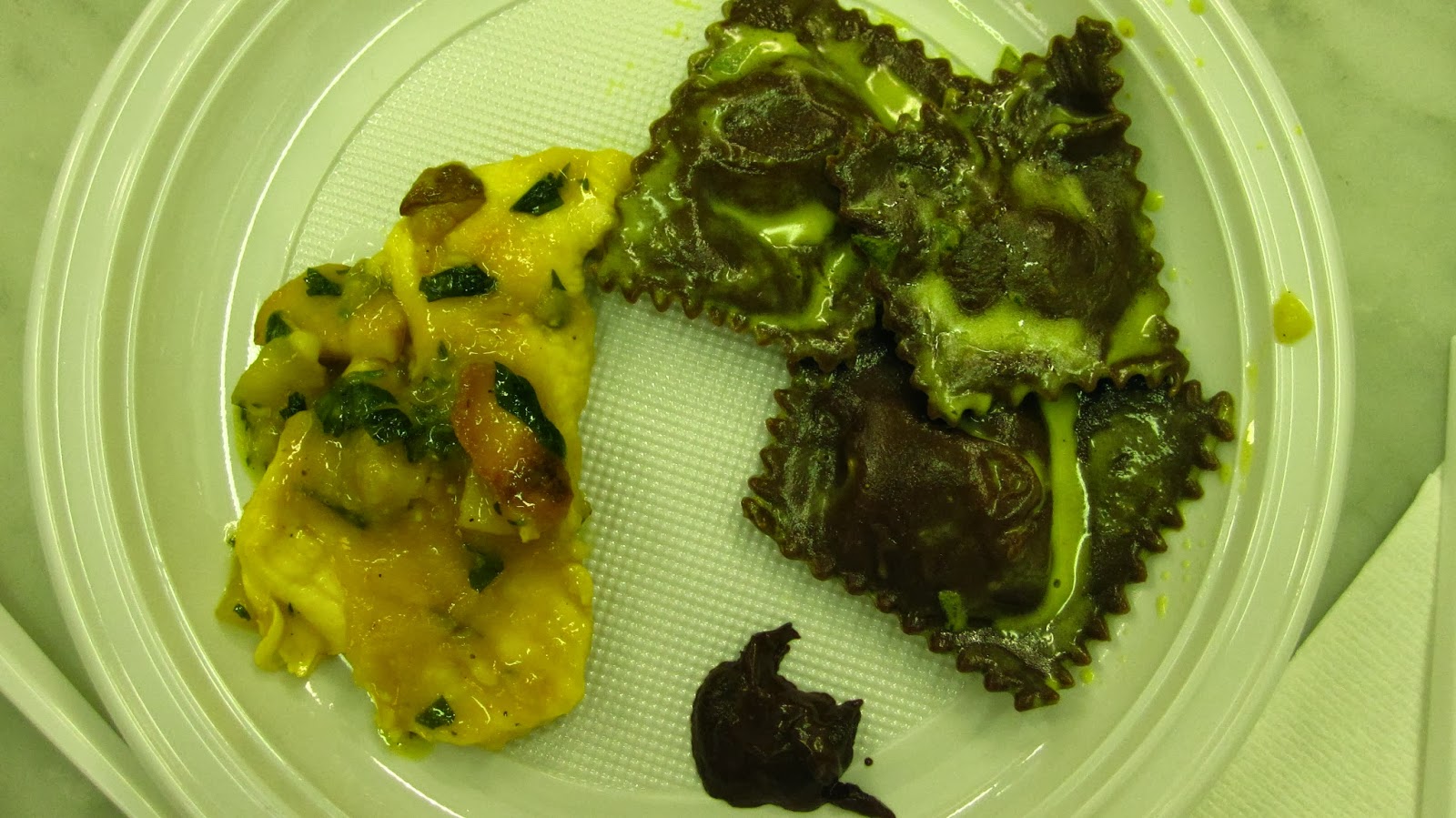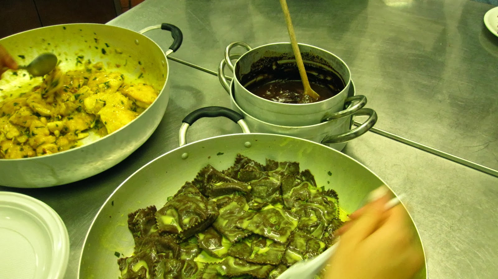 So what did we make? Ravioli di cacao al brie e pere (chocolate ravioli with pear and brie), Pollo con funghi porcini, mele verdi e cioccolato (chicken with mushrooms, green apples, and chocolate), and Torta Caprese al mango e sorbetto limone (chocolate cake with mangoes and lemon sorbet).