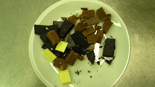 So in my cooking class this week our concentration was chocolate! I know I literally died! So we started class with none other than a chocolate tasting. We started out with white chocolate then went from milk chocolate, to milk chocolate with hazelnuts, to 70% cacao, and then 85% cacao. Yum! If you're looking for some cheap fantastic chocolate my teacher says Lindt is some of the best inexpensive mass produced chocolate you can find. Also these pictures are really crappy, but believe me everything was amazing!